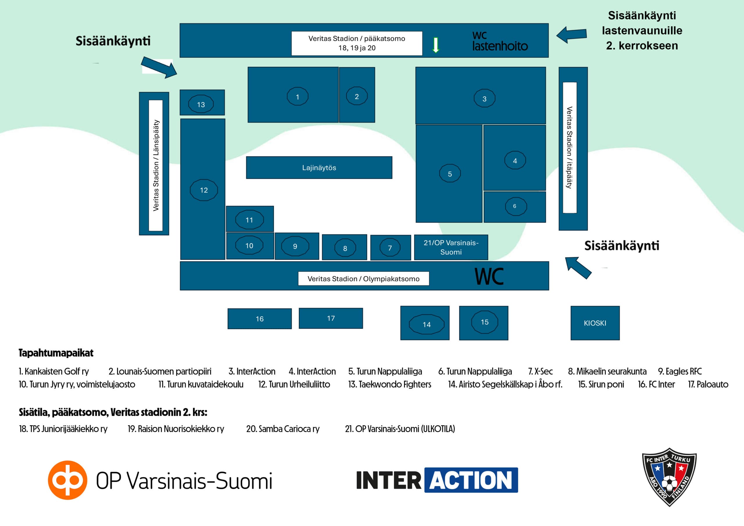 Tapahtuman aluekartalta näet monipuoliset tapahtumapisteet. Toimintaa on sekä kentällä, Olympiakatsomon takana että pääkatsomon 2. kerroksen sisätiloissa. Sisäänkäynnit Veritas Stadionille sijaitsevat Olympiakatsomon ja itäpäädyn välistä sekä pääkatsomon ja länsipäädyn välistä. Pääkatsomon 2. kerrokseen sisäänkäynti lastenvaunuilla on pääkatsomon itäpäädyssä sijaitsevalla hissillä.
