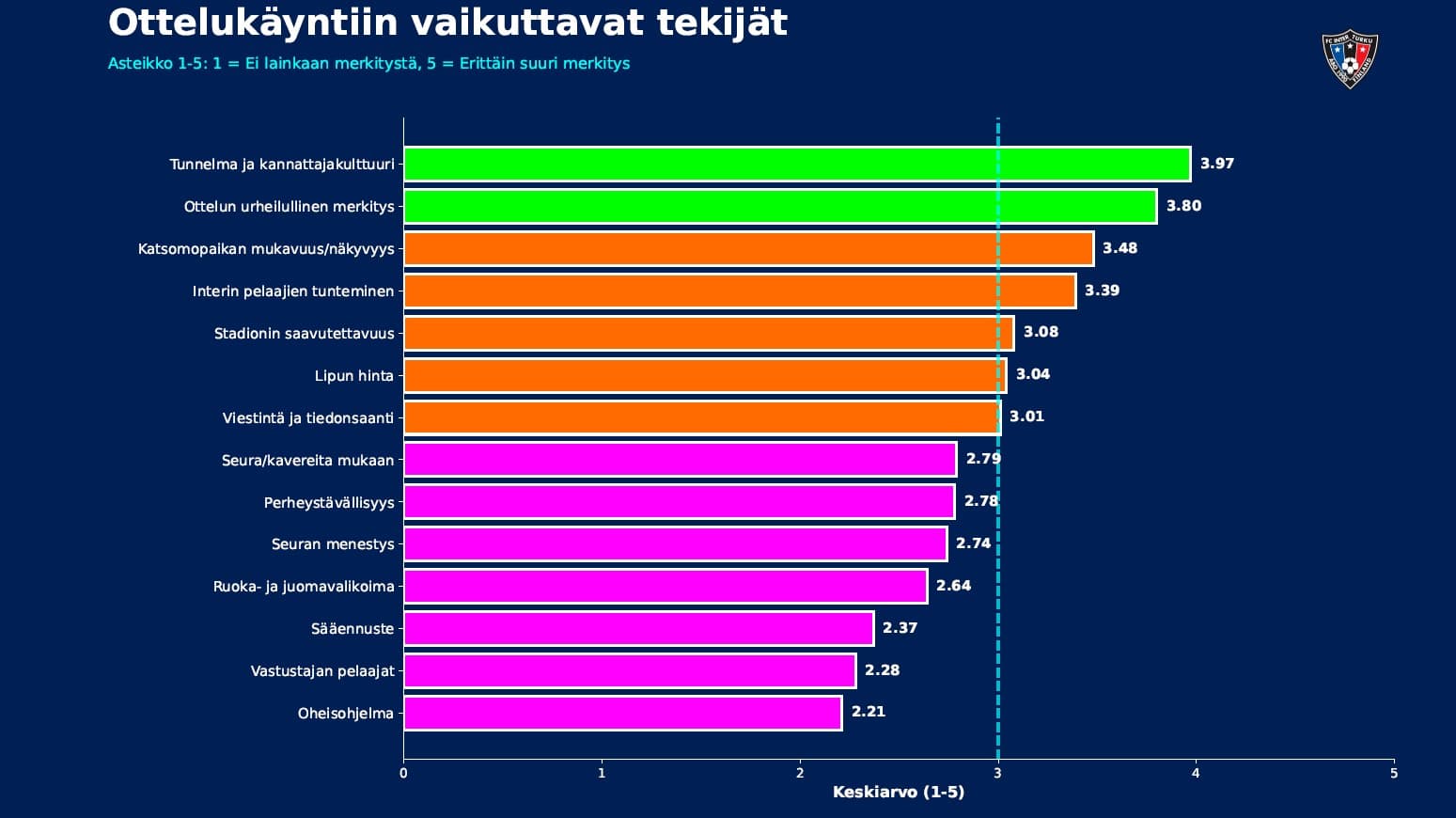 Ottelupäivän sääennusteella tai vastustajan pelaajien tunnistamisella ei ollut juurikaan vaikutusta vastaajien ottelukäynteihin. Ottelutapahtuman oheisohjelma ei ole tällä hetkellä merkittävä tekijä ottelukäynteihin, mutta tilastoanalyysin mukaan sillä voi olla kasvava merkitys, sillä oheisohjelmaa tärkeänä pitävät käyvät katsomassa keskimäärin enemmän otteluita kauden aikana. Ottelutapahtuman kehittämisestä lisää alkuvuoden 2026 aikana.
